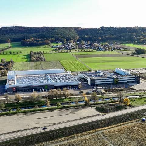 - The new building is one of the few KfW40-standard industrial buildings in Bavaria (district heating, building heating and cooling by means of concrete core activation, 3,400-m² green roof, PV systems on site with approx. 1,250 kWp)